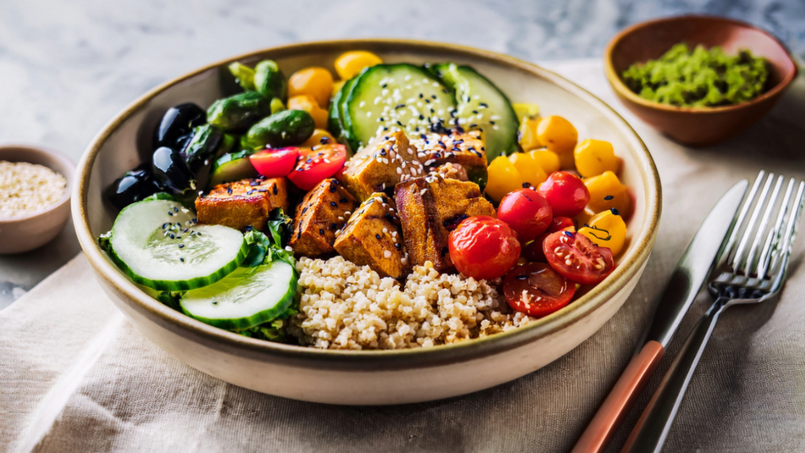 1. Add one protein anchor per meal (hard tofu, tempeh, legumes, seitan).